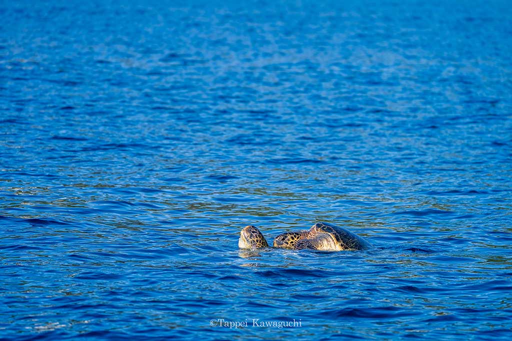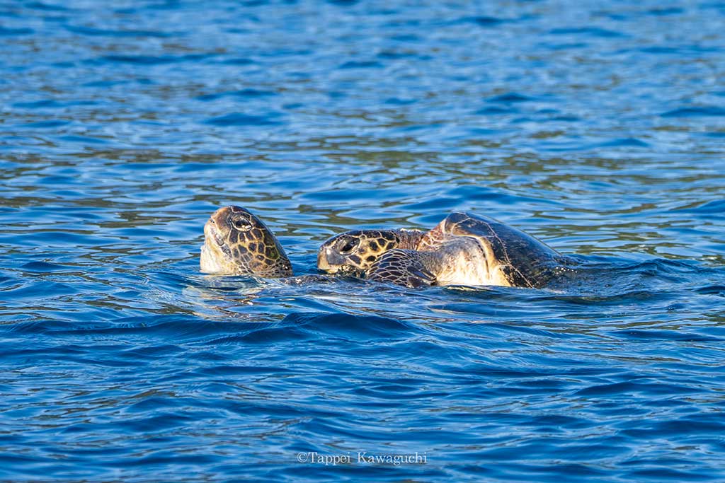 水面に何か浮いていると思うと、海亀が交尾している姿を目撃できるこの時期。